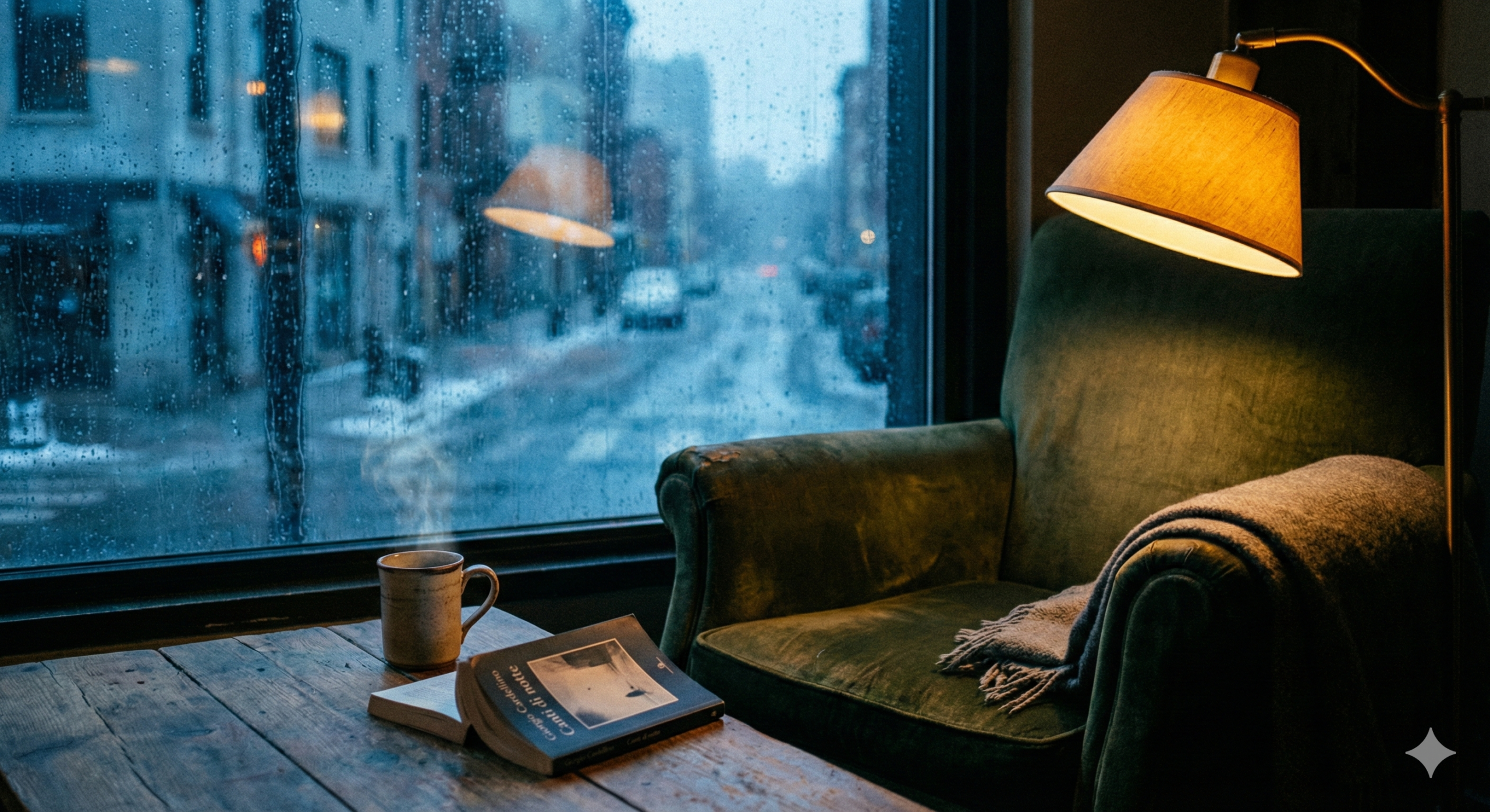 Immaginate la scena perfetta. Fuori è novembre (o un aprile capriccioso). Il cielo è color piombo. La pioggia batte contro i vetri con quel suono che varia d’intensità, ora un sussurro, ora uno scroscio violento. Siete in casa. Avete spento la televisione. Il telefono è lontano, in silenzio. Avete acceso solo una piccola lampada, quella con la luce calda, gialla, che illumina solo un angolo della stanza. Siete seduti sulla vostra poltrona preferita, o magari raggomitolati sul divano con una coperta sulle gambe. C’è una tazza che fuma sul tavolino. Tè, caffè, cioccolata, un bicchiere di vino rosso. Non importa cosa, purché sia un conforto.